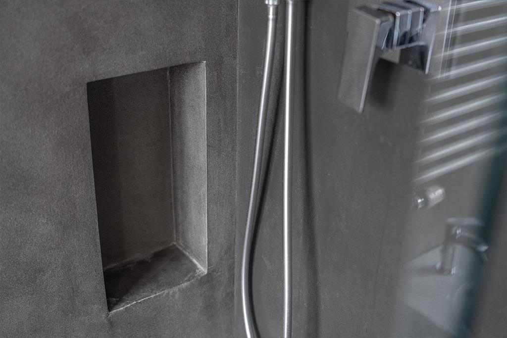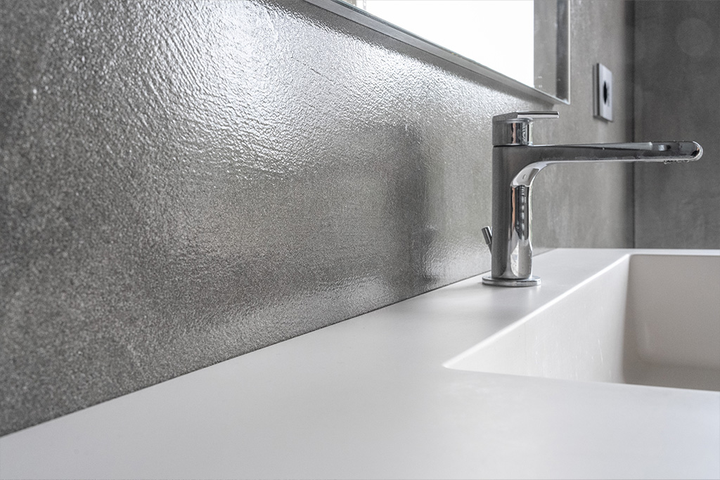 Bagno in Resina con finitura Metallo e Pietra continua.