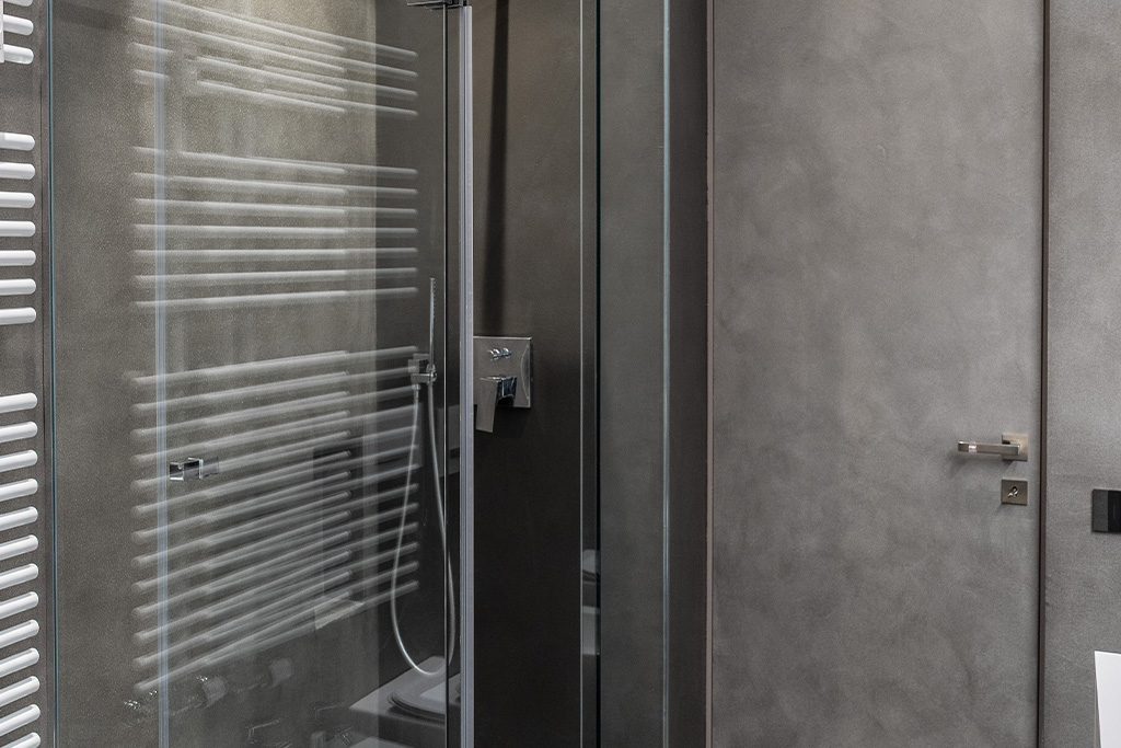 Pareti e porta con decorativo Metallo, pavimento e piatto doccia in decorativo Pietra continua.