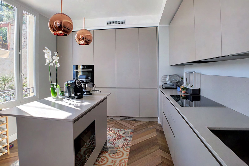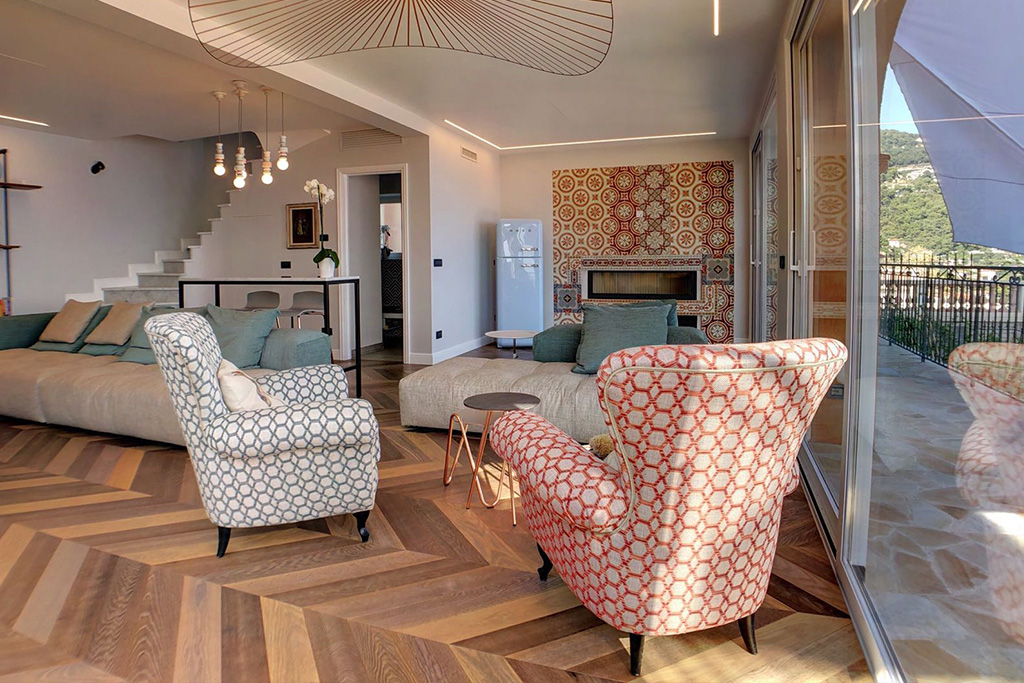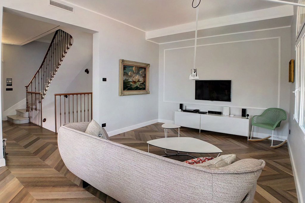 La posa a Spina 45 gradi arricchisce questa splendida Villa su mare curata nei minimi dettagli, dalla progettazione all’arredamento.