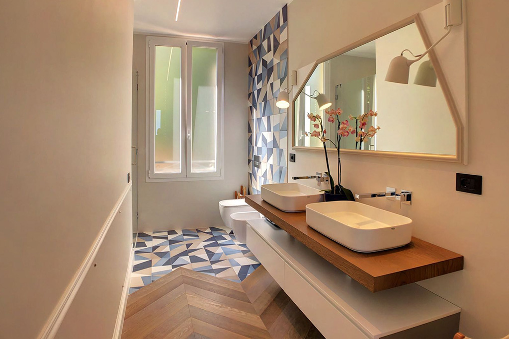 Una richiesta specifica del committente è stata soddisfatta realizzando un parquet unico nel suo genere con molteplici sfumature di colori, grazie alle sapienti mani di Cadorin ed un mix di Rovere selezionato ad hoc.